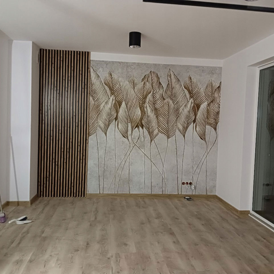 - klejem smarujemy ścianę oraz tapetę. Nakładamy pasy tapety na styk (bryt do brytu)